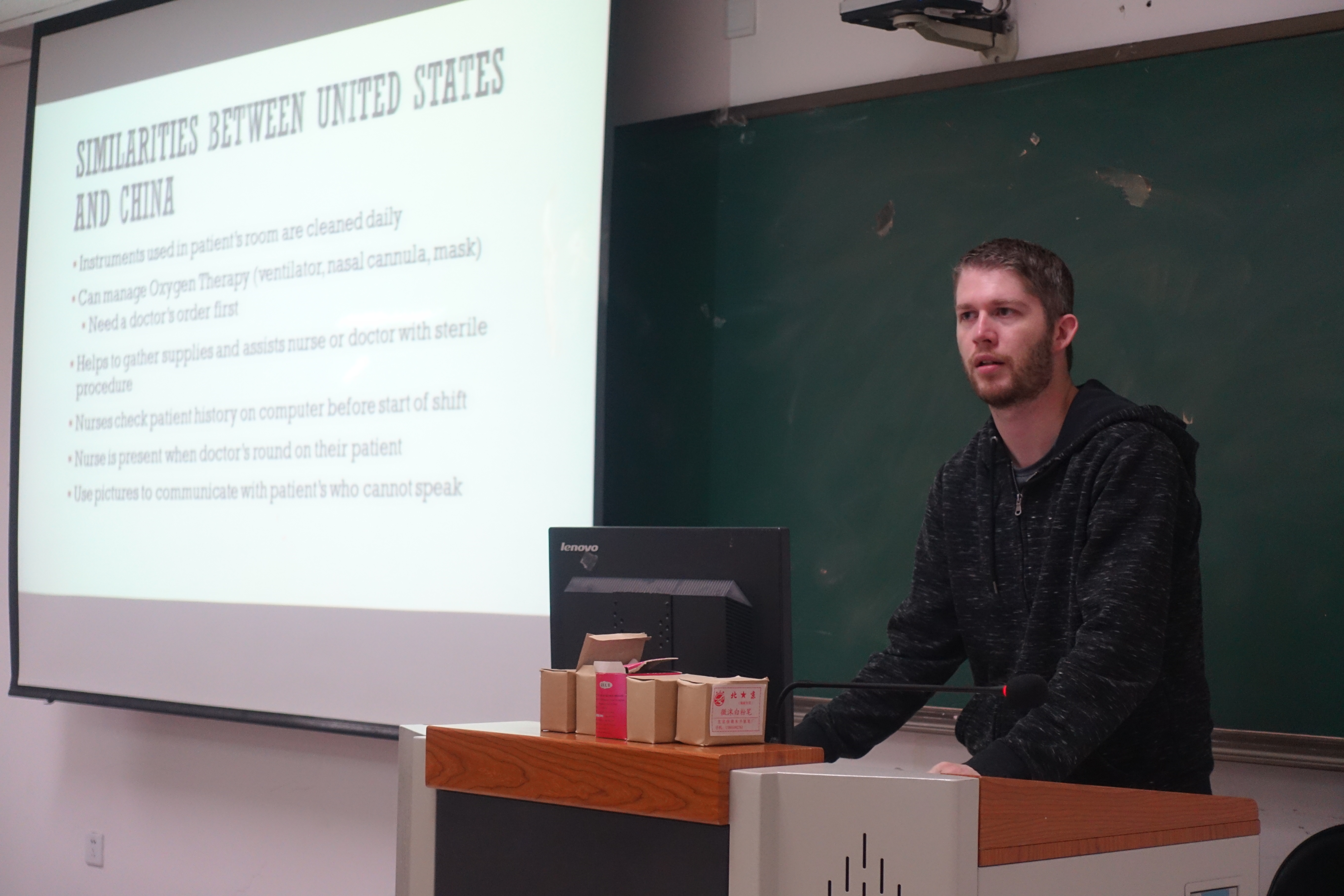 之后的双方护理交流环节,交流生代表Jeff Downs向我们详细展示了他们在交流期间感受到的两国的护理差异。哔咔漫画官网 学生代表陈芷谦向大家详细地介绍了我国临床护理的工作内容和工作流程。通过两位同学的展示和讲解,让大家更加深刻地了解到了两国的护理现状。