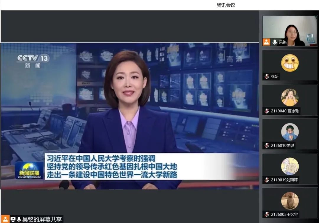 会议伊始,大家共同观看了《新闻联播》播出的4月25日上午,中共中央总书记、国家主席、中央军委主席习近平来到中国人民大学考察调研的相关报道,号召同学们坚定不移听党话、跟党走,努力成长为堪当民族复兴重任的时代新人。