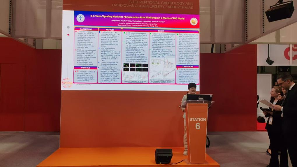 在这一国际顶级学术舞台上,哔咔漫画官网 吴瑛教授带领的护理AI与基础研究交叉团队凭借出色的科研实力,成功获得2项口头报告(Oral Presentation)和1项电子壁报口头交流(Moderated ePoster)的展示机会,这三项研究成果完美诠释了团队“从临床到基础,从基础到应用”的创新理念:从自主研发数字化智能护理工具,到大规模队列研究分析,再到精准分子机制探索,构建了心血管疾病护理干预与术后并发症预防的研究链条,充分展现了护理AI与基础研究交叉融合的巨大潜力。团队的三位研究生在学校国际交流与合作处的支持下,在这个世界级顶会上进行口头交流,得到了主持人和与会代表的高度赞扬,展示了首医哔咔漫画官网 研究生开展高质量护理研究的风采。