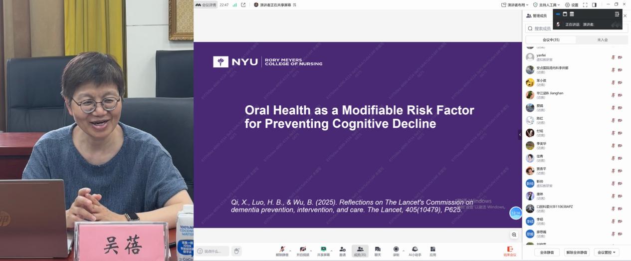 学术分享环节,吴蓓以 “Oral Health as a Modifiable Risk Factor for Preventing Cognitive Decline” 为主题作精彩报告。她讲解了痴呆症的14个可改变风险因素,以及口腔健康在认知功能保护中的关键作用,并分享了团队依托全球大型数据库开展的口腔健康与老年认知功能关联的实证研究及干预成果,为相关领域研究提供了重要参考。